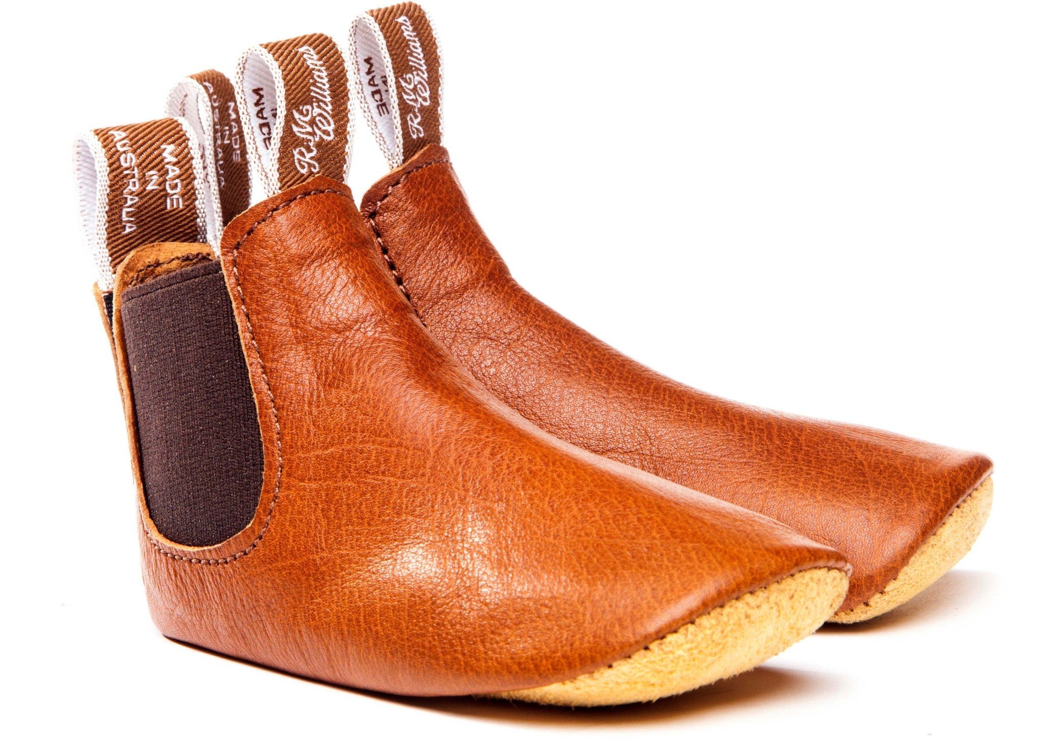 Introduce your little one to timeless Australian craftsmanship with the R.M. Williams Baby Booties in Tanbark. These miniature versions of the iconic Craftsman Boot are meticulously handcrafted in Adelaide from premium kangaroo leather, known for its lightweight durability and softness. Designed for children aged 3 to 18 months, they feature elastic side panels and Velcro fastenings at the heel, ensuring ease of wear and a secure fit. The leather-lined interior and padded leather sole provide comfort for tiny feet, while the double branded tugs add a touch of authenticity. Each pair comes in a branded gift box, making them an ideal gift for the discerning parent.